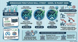 Berikut adalah penjelasan mendalam mengenai penutupan pasar saham Amerika Serikat (Wall Street) pada Senin, 16 Maret 2026, yang disusun dalam format poin-poin untuk memudahkan analisis: Pergerakan Indeks Utama Wall Street ….