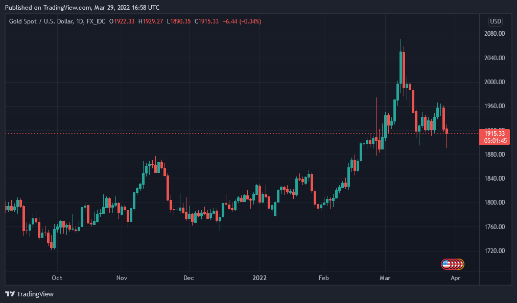 Harga emas spot turun 0.54% $1,912.82 per ounce, sedangkan harga emas futures di Comex New York jeblok 1.5% to $1,910.70. Sedangkan saat berita ini ditulis pada hari Selasa malam. penurunan XAU/USD tampak sudah berkurang dan diperdagangkan di $1,915.33